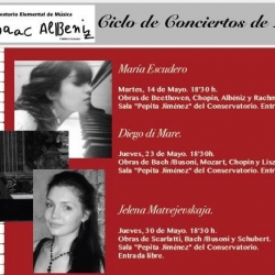 El Conservatorio Elemental de Música "Isaac Albéniz" de Cabra ha comunicado a través de una Nota que durante el mes de mayo tendrá lugar en la Sala "Pepita Jiménez" del Conservatorio un ciclo de conciertos de piano.La actividad está organizada por el Conservatorio con la colaboración de la Delegación de Cultura del Ayuntamiento de Cabra. La entrada será libre hasta completar el aforo de la sala.