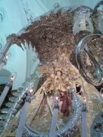 Llega el 8 de septiembre y todo está listo para la celebración de la fiesta de nuestra Patrona, María Santísima de la Sierra. La parroquia de la Asunción y Ángeles está preparada y engalanada para la fiesta de la Natividad de la Virgen, en la que celebramos también el Día de la Sierra. La Virgen luce el manto y la corona de la Coronación e irá engalanada con nardos y orquideas rosas y blancas. También estrena dos rosetones en los centros del resplandor, que han sido recuperados y que lucía antiguamente.