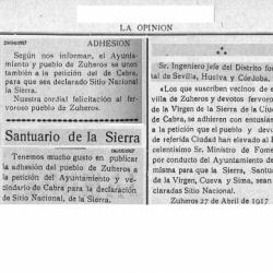 La prensa de la época habla de 28 pueblos devotos de la Virgen de la Sierra los que se adhirieron a la petición de la Declaración del Picacho de Cabra como Sitio Nacional. Entre ellos nos consta la petición de Monturque, Luque o Zuheros. Éste último, envió su carta de adhesión al Ayuntamiento de Cabra el 27 de abril de 1917, probablemente fuese el primero en hacerlo.