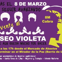 Los actos en torno al Día Internacional de la Mujer trabajadora se inician el próximo 8 de marzo con una mesa redonda "La evolución de la mujer a lo largo de la Historia" que será a las 9:30h en el Instituto Aguilar y Eslava. La marcha violeta será a las 17:00h desde la plaza de abastos organizada por las asociaciones de mujeres de Cabra.