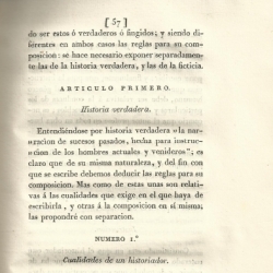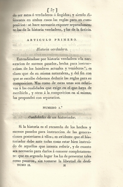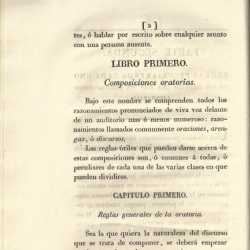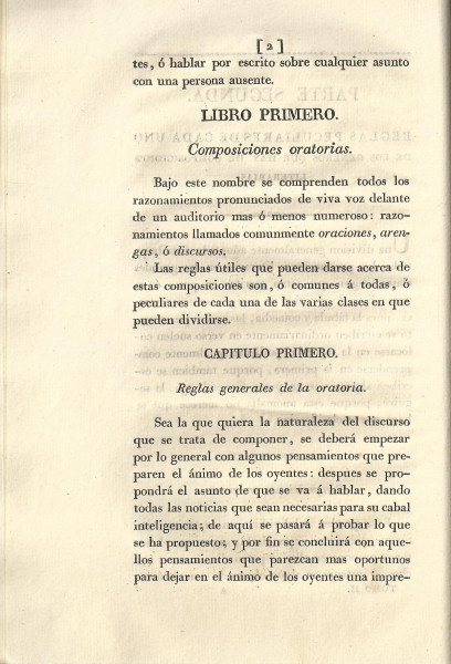 En el tomo primero nos presenta las reglas comunes a todas las composiciones; en el tomo segundo serán las reglas peculiares de cada uno de los géneros que hay de composiciones literarias. Hemos observado en la encuadernación, de calidad, que están cambiadas las hojas que deben acompañar a las portadas de cada volumen. Es decir, las del tomo segundo acompañan la portada del primero y la del primero están encuadernadas en la portada del segundo.