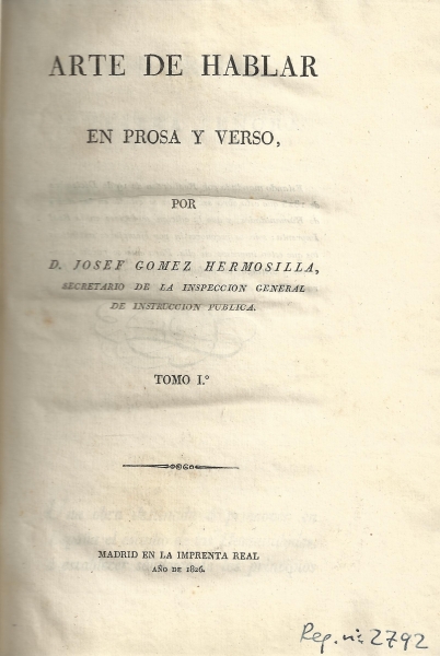Arte de hablar en prosa y verso / por Josef Gomez Hermosilla.-- Madrid : en la Imprenta Real, 1826.