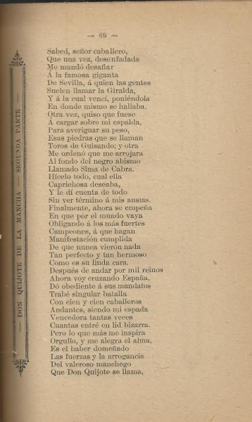 Como suele ocurrir en estos casos, tratamos de comparar el original con la versificación que nos propone el autor malagueño. Y para ello nos hemos ido directamente al pasaje en el que se habla de la sima de Cabra: "Capítulo XIV (de la segunda parte), donde se prosigue la aventura del Caballero del Bosque". Mientras los dos escuderos almorzaban, sus amos conversaban sobre su oficio y sus galanteadas; el Caballero del Bosque decía que su amada Casildea de Vandalia era muy hermosa, y que por ella estaba recorriendo España para propagar a todos los caballeros con los que se cruzase que ella es la más sublime amada; y que él, es el más valiente y enamorado caballero: "Una vez me mandó que fuese a desafiar a aquella famosa giganta de Sevilla llamada la Giralda, que es tan valiente y fuerte como hecha de bronce, y sin mudarse de un lugar es la más movible y voltaica mujer del mundo. Llegué, vila y vencila, y hícela estar queda y a raya, porque en más de una semana no soplaron sino vientos nortes. Vez también hubo, que me mandó a tomar en peso las antiguas piedras de los valientes toros de Guisando, empresa más para encomendarse a ganapanes que a caballeros; otras ves me mandó que me precipitase y sumiese en la sima de Cabra, peligro inaudito y temeroso, y que le trujese particular relación de lo que en aquella escura profundidad se encierra". De estas proezas señala el caballero: "Detuve el movimiento a la Giralda, pesé los toros de Guisando, despeñeme en la sima y saqué a luz lo escondido de su abismo, y mis esperanzas, muertas que muertas, y sus mandamientos y desdenes, vivos que vivos".
