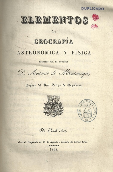 Elementos de Geografía astronómica y física / escritos por el Coronel D. Antonio de Montenegro. -- Madrid : [s.n.], 1828 (Imprenta de D.E. Aguado)