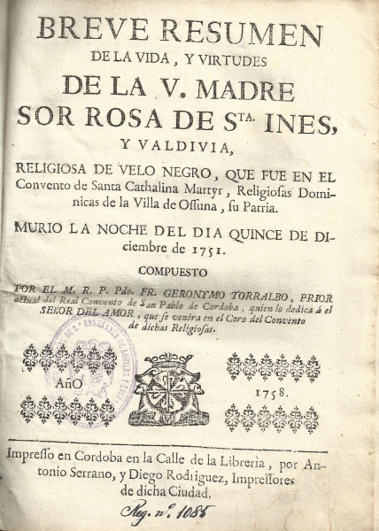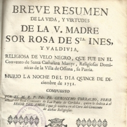 Breve resumen de la vida, y virtudes de la V. Madre Sor Rosa de Sta. Ines, y Valdivia, religiosa de velo negro, que fue en el Convento de Santa Cathalina Martyr, religiosas dominicas de la Villa de Ossuna, su patria. Murio la noche del dia quince de diciembre de 1751 / compuesto por el M. R. P. Pdo. Fr. Geronymo Torralbo.-- Impresso en Cordoba : por Antonio Serrano, y Diego Rodriguez ...,1758.