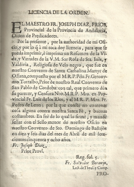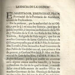 En las páginas primeras del libro, antes del inicio del relato de la vida de sor Rosa de Santa Inés, encontramos todos los requisitos de la publicación: la dedicatoria (a la que hemos aludido), la censura correspondiente, la licencia del ordinario, el parecer y dictamen, la licencia del señor juez de imprentar, la aprobación del provincial de Andalucía de la Orden de Predicadores, la licencia de la Orden, una protesta del autor y un prólogo.