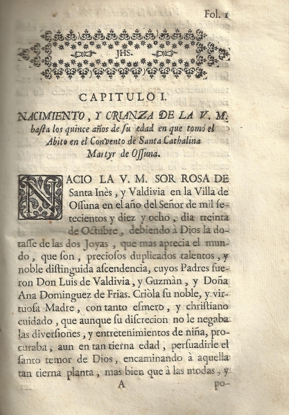 El primer capítulo habla del nacimiento y crianza de la venerable madre hasta los quince años, edad en la que toma el hábito en el convento de Santa Catalina Mártir de Osuna, su lugar de nacimiento. Los padres fueron don Luis de Valdivia y Guzmán y doña Ana Domínguez de Frías. Como se anuncia en la portada del libro, sor Rosa de Santa Inés murió la noche del 15 de diciembre de 1751. También se dice en la portada que es religiosa de velo negro.