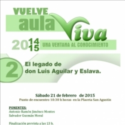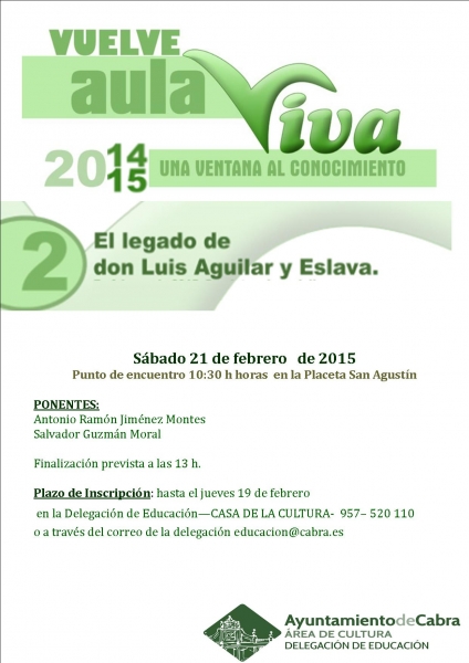La delegación de Educación del Ayuntamiento de Cabra ha convocado para este próximo sábado 21 de febrero, una nueva jornada de Aula Viva para el conocimiento de nuestra ciudad. En esta ocasión, AULA VIVA está dedicada a conocer el legado de don Luis de Aguilar y Eslava.