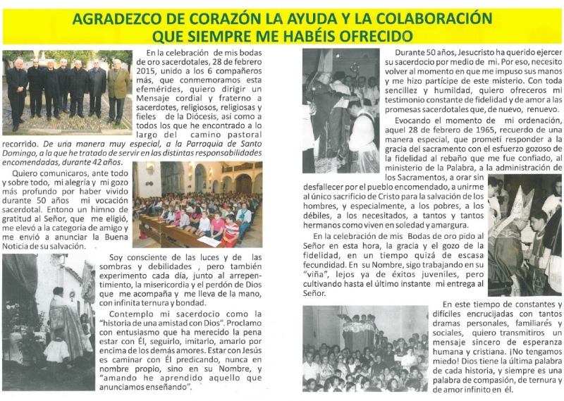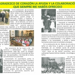 Noveno, recordando aquel primer gesto del Papa Francisco, en la plaza de san Pedro, la noche de su elección, tambien nosotros inclinamos humildemente nuestra cabeza, guardamos silencio y pedimos vuestras oraciones, sintiendo viva y ardiente aquella emoción de nuestra ordenación sacerdotal, mientras agradecemos de corazón el bien, la ayuda generosa y la colaboración constante que nos habéis ofrecido en estos 50 años.