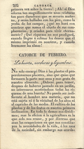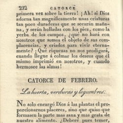 Como ejemplo, el día catorce de febrero está dedicado a la huerta, verduras y legumbres: "No solo encargó Dios a las plantas el proporcionarnos placeres, sino que quiso que formasen la parte más sana y más grata de nuestro alimento...".