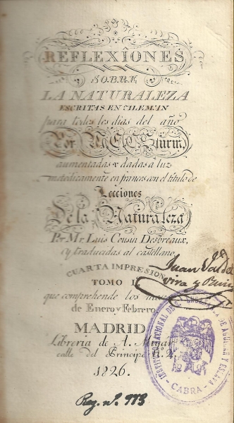 Reflexiones sobre la naturaleza / escrita en aleman para todos los dias del año por M.C.C. Sturm ; aumentadas y dadas a luz metódicamente en frances con el título de Lecciones de la naturaleza por Mr. Luis Cousin Despréaux ; y traducidas al castellano.-- 4ª imp.-- Madrid : Libreria de A. Miyár, 1826 ( Imp. de D. Miguel de Burgos)