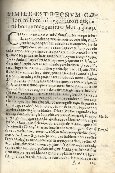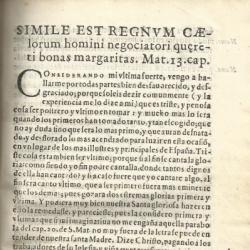 Esta cita anterior del evangelio de San Mateo corresponde a las parábolas del tesoro y de la perla: "También es semejante el Reino de los Cielos a un mercader que anda buscando perlas finas" (y que, al encontrar una perla de gran valor, va, vende todo lo que tiene y la compra). Las páginas de la alocución se acompañan de apostillas marginales que indican la acotación que desarrolla.