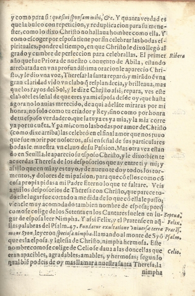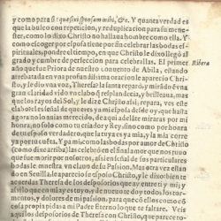 Seleccionamos el siguiente texto de una de sus páginas: "Mas otra vez, estando en Sevilla, le apareció su esposo Cristo y le dijo: bien te acuerdas Teresa de los desposorios que hay entre tú y yo; y así lo que en mí hay es tuyo, y de nuevo te doy todos los tormentos y dolores de mi pasión para que con ellos con cosa propia pidas a mi Padre Eterno lo que te faltare".