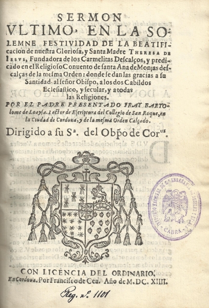La conmemoración del V Centenario del Nacimiento de Santa Teresa de Jesús (1515-2015) nos sirve de pretexto para dar a conocer como Libro de la Semana otra de las joyas bibliográficas conservadas en la Biblioteca Histórica Aguilar y Eslava. Se trata del "Sermón último en la solemne festividad de la beatificación de nuestra gloriosa y santa madre Teresa de Jesús, fundadora de los Carmelitas Descalzos y predicado en el religioso convento de Santa Ana de Monjas descalzas de la misma Orden: donde se dan las gracias a su Santidad el señor Obispo, a los dos Cabildos Eclesiásticos y secular y a todas las religiones, por el padre presentado fray Bartolomé de Loaysa, lector de escritura del colegio San Roque, en la ciudad de Córdoba y de la misma orden calzado. Dirigido a su S.ª del Obispo de Córdoba". El discurso cristiano está impreso en Córdoba por Francisco de Cea en el año 1614.