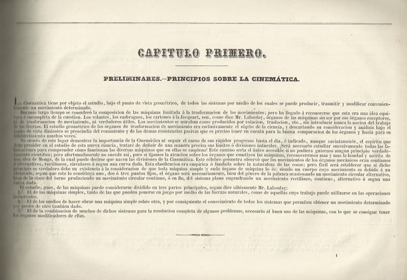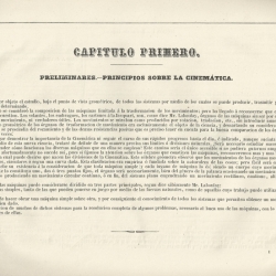 La disertación está estructura en diez capítulos. En el primero define el objeto de los principios sobre la cinemática como "el estudio, bajo el punto de vista geométrico, de todos los sistemas por medio de los cuales se puede producir, transmitir y modificar convenientemente un movimiento determinado". En el capítulo segundo habla de la composición y descomposición de fuerzas, en el tercero de los centros de gravedad, en el cuarto del equilibrio de un punto material, en el quinto del equilibrio de un solo cuerpo, en el sexto del equilibrio de varios cuerpos, en el séptimo del equilibrio de un hilo flexible, en el octavo del principio de las velocidades virtuales, en el noveno de momentos de inercia y en el décimo de centros de giro y de oscilación. Dos terceras partes de las páginas (apaisadas) están dedicadas a las cuestiones y la otra tercera parte a soluciones y anotaciones.