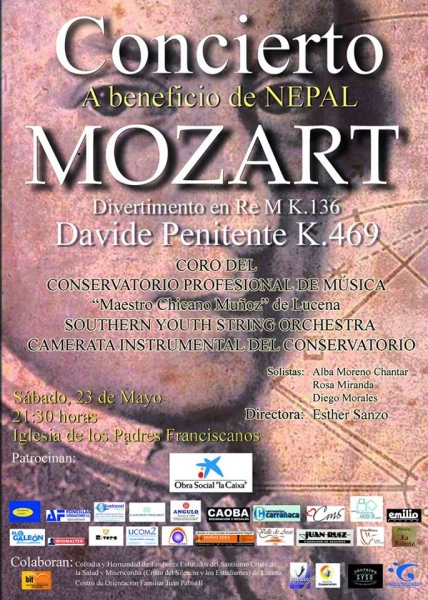 El próximo sábado 23 de mayo a las 21:30 h en la iglesia de la Madre de Dios de los R.R.P.P. Franciscanos de Lucena, extraordinario concierto a beneficio de Nepal ofrecido por el Coro y Camerata instrumental del CPM "Maestro Chicano Muñoz" junto a la orquesta SYSO. Las entradas para asistir al concierto, que se pueden adquirir en el Conservatorio Profesional de Música, Videoluc Televisión y la boutique Carmen Molero, tienen un precio de 8 euros así como también se fija una fila 0 con una donación de 3 euros.