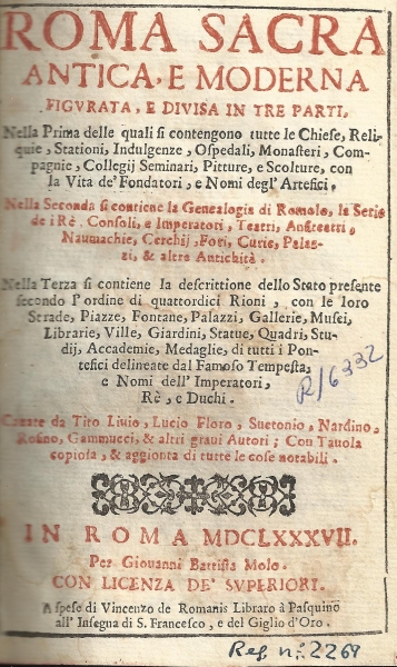 Roma sacra antica e moderna figurata, e divisa in tre parti : nella prima delle quali si contengono tutte le Chiese, reliquie, stationi ... ; nella seconda si contiene la genealogia di Romolo, la sere de i Rè, Consoli ... ; nella terza si contiene la descrittione dello stato presente secondo l´ordine di quattordici Rioni ... / cauare da Tito Liuio, Lucio Floro, Suetonio, Nardino, Rosino, Gammucci, altri graui autori ... -- In Roma : per Giouanni Battista Molo : a spese di Vicenzo de Romanis ..., 1687