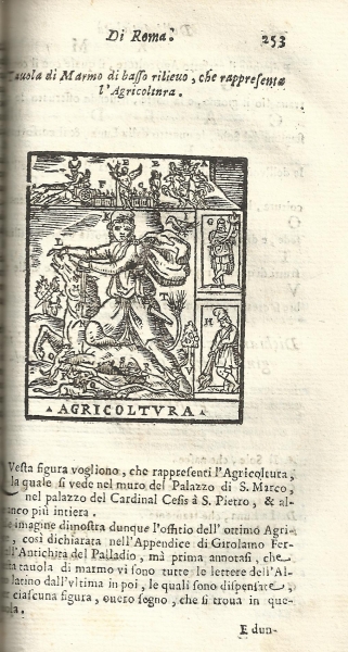 Si en la primera parte nos encontramos con la Roma sacra, en la segunda se nos documenta el origen y progreso del alma de la ciudad y su antigüedad. Contiene la genealogía de Rómulo, la serie de los reyes, cónsules y emperadores, teatros, anfiteatros, edificios para combates navales, circos, foros, arcos de triunfo, termas, columnas y otras antigüedades, como castillos, obeliscos, bibliotecas, mausoleos, etc. Son 256 páginas de las cuales las cuatro últimas son para estatua de Marforio (una de las seis estatuas parlantes de Roma, cuya figura se halla en el Palazzo dei Conservatori) y para un bajo relieve en el que se representa a la Agricultura, y que nos recuerda la escultura del dios Mitra sacrificando al toro; se localiza en la Palazzo di S. Marco. Las distintas representaciones que figuran se identifican con una letra: A, B, C, D, E, F, G, H, I, K, L, M, N, O, P, Q, R, S, y T, estando relacionadas con el sol; la naturaleza, compañera del sol; los tres tiempos del sol; la luna; la naturaleza de las cosas; los cuatro tiempos de la luna; el día; la noche; el cuervo, como la diligencia; el laboratorio de la tierra; el toro, como significado de la tierra; el cuchillo clavándose en el toro, que demuestra el esfuerzo; la sangre, fruto de la tierra; el perro, como testimonio de amor; la serpiente, argumentando la providencia; el león, simbolizando la fuerza; el cangrejo, que indica la creación; el escorpión, como la generación; la espiga, fruto de la tierra y el árbol nocturno y el diurno.