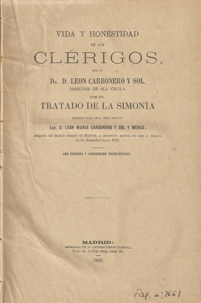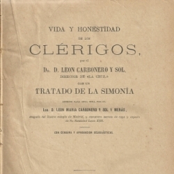 Vida y honestidad de los clérigos / por el Dr. Leon Carbonero y Sol. Con un Tratado de la simonía / escrito para esta obra por Leon María Carbonero y Sol y Merás.-- Madrid : [s.n.], 1880 (Imp. de Antonio Perez Dubrull)