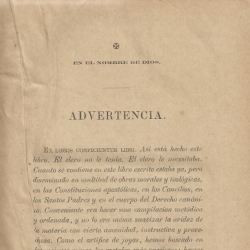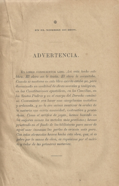 Antes de la trascripción del texto de la censura eclesiástica se hace una advertencia en nombre de Dios: "Ex libris conficiuntur libri. Así está hecho este libro. El clero no le tenía. El clero le necesitaba. Cuanto se contiene en este libro escrito estaba ya, pero diseminado en multitud de obras morales y teológicas, en las Constituciones apostólicas, en los Concilios, en los Santos Padres y en el cuerpo del Derecho canónico". Carbonero añade a su advertencia que era conveniente "hacer una compilación metódica y ordenada, y no lo era menos suavizar la aridez de la materia con cierta amenidad, instructiva y provechosa. Como el artífice de joyas, hemos buscado en las mejores minas los metales más preciosos; hemos penetrado en el fondo de las bibliotecas para sacar de aquel mar inmenso las perlas de oriente más puro. Con estos elementos hemos hecho esta obra, que, si es pobre por la mano de obra, es riquísima por el mérito y valor de las primeras materias".