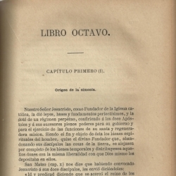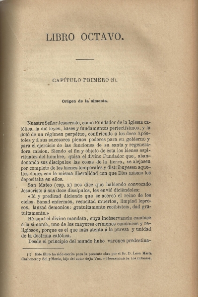 Con respecto al "Tratado de la simonía", la definición que nos da el DRAE de la palabra es "compra o venta deliberada de cosas espirituales, como los sacramentos y sacramentales, o temporales inseparablemente anejas a las espirituales, como las prebendas y beneficios eclesiásticos". La autoría de este tratado corresponde al hijo de Carbonero y Sol, León María, y ocupa el libro octavo como hemos reseñado anteriormente. Está dividido en 17 capítulos, iniciándose con la explicación de su origen, su definición, la división de la misma en dos tipos: de derecho natural o divino y simonía de derecho eclesiástico; continua con la condenación de la simonía por derecho divino y eclesiástico, etc., finalizando los últimos capítulos con la dispensa de las penas contra la simonía y reseña histórica de las investiduras.