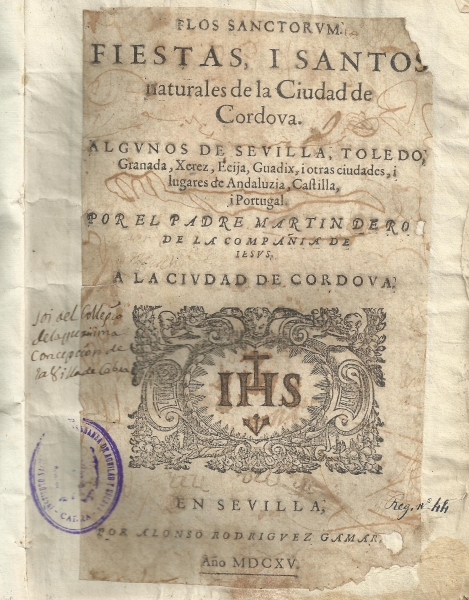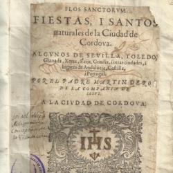 Flos sanctorum : fiestas, i Santos naturales de la ciudad de Cordova, algunos de Sevilla, Toledo, Granada, Xerez, Ecija, Guadix, i otras ciudades, i lugares de Andaluzia, Castilla, i Portugal / por el Padre Martin de Roa de la Compañia de Iesus.-- En Sevilla : por Alonso Rodriguez Gamarra, 1615.