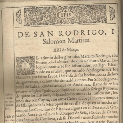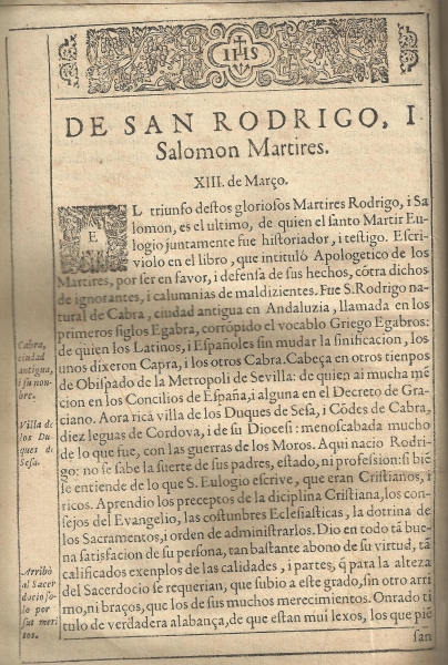 Con respecto a los mártires egabrenses, San Rodrigo aparece junto a Salomón, el 13 de marzo, remitiéndonos el autor al Apologético de los Mártires de San Eulogio, fuente lógica y principal de lo que relata Martín de Roa en su estudio (María Jesús Aldana García publicó en 1998, Universidad de Córdoba, la traducción completa de las obras en latín de S. Eulogio, con numerosas notas y extraordinaria introducción). Las apostillas marginales en las páginas ayudan a seguir la historia del mártir egabrense: "Cabra, ciudad antigua y su nombre"; "Villa de los duques de Sesa", etc. (hojas 41 a 48).