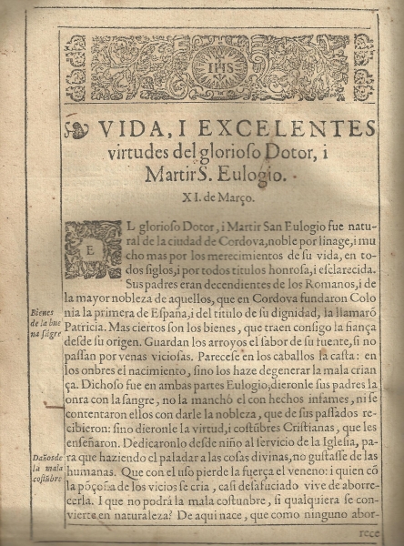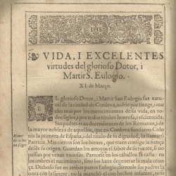 "Flos sanctorum: fiestas, i Santos naturales de la ciudad de Cordova, algunos de Sevilla, Toledo, Granada, Xerez, Ecija, Guadix, i otras ciudades, i lugares de Andaluzia, Castilla, i Portugal" por el Padre Martin de Roa (Sevilla, 1615)