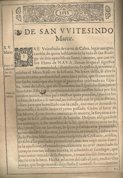 El 15 de mayo sitúa la festividad de San Witesindo, "de tierra de Cabra, lugar antiguo y noble". Dos páginas ocupan su corta biografía, ampliada en Martín de Roa con respecto a S. Eulogio al hablarnos de la Nava (alude a la historia del moro Rasis) y también ocupándose de la sima de Cabra: "No lejos de ella [se refiere a la Nava], se abre la tierra en tanta profundidad entre unas peñas, que se cree no tener suelo, tanto que dio lugar al proverbio celebrado en España, sima de Cabra, que así llamamos los españoles semejantes honduras".