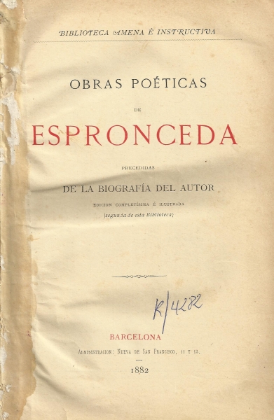 Obras poéticas / de Espronceda ; precedidas de la biografía del autor.-- Ed. Completísima é ilustrada.-- Barcelona : Administracion Nueva de San Francisco, 11 y 13, 1882 (Impr. Barcelonesa)