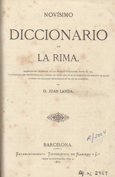 Novísimo diccionario de la rima / ordenado en presencia de los mejores... por Juan Landa.-- Barcelona : [s.n.], 1867 ( Establecimiento Tipográfico de Ramírez y C.ª)