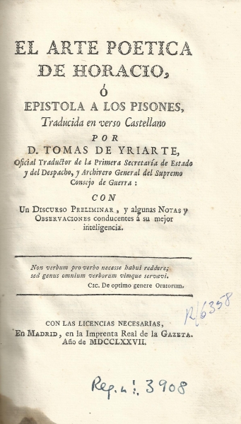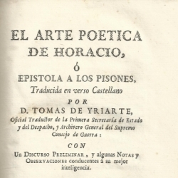 El arte poetica de Horacio o Epistola a los Pisones / traducida en verso castellano por D. Tomas de Yriarte... ; con un discurso preliminar y algunas notas y observaciones.-- En Madrid : en la Imprenta Real de la Gazeta, 1777.