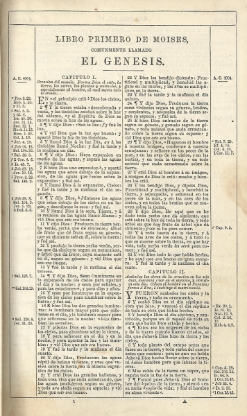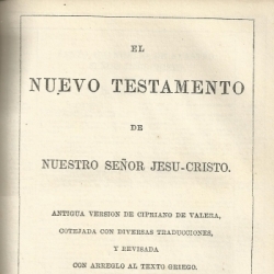 La obra de Cipriano de Valera que más ha contribuido a su fama es, sin duda alguna, la versión de la Biblia del Oso de Casiodoro de Reina. El texto del ejemplar que reseñamos está a dos columnas, enmarcado y con apostillas marginales. La parte del Nuevo Testamento tiene portada propia.
