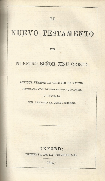 La Santa Biblia que contiene los Sagrados libros del Antiguo y Nuevo Testamento / antigua versión de Cipriano de Valera.-- Oxford : [s.n.], 1865 (Imprenta de la Universidad)