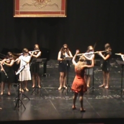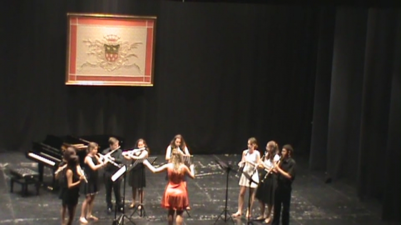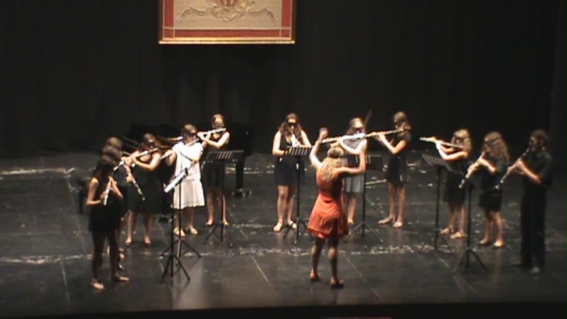 CONCIERTO DE CLAUSURA fue lo más señalado, siendo el día 20 en el mismo teatro, "El Jardinito", y oímos dúos, tríos y cuartetos de flautas, oboes, clarinetes, violines, violas y piano. También dos Bandas "Los canónigos" y "Z" formadas por instrumentos de viento tocaron a Pachelbel y Horner con la buena dirección de la profesora de oboe, María Fernández y lo más espectacular fue la Orquesta "Cortijo", de cuerda, viento y 2 pianos, que con su director Javier Sanchis nos hicieron "La vida es bella" de N. Piovani, que gustó muchísimo, según el "barómetro" de las palmas.