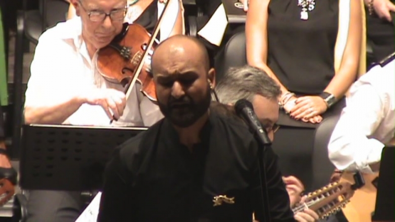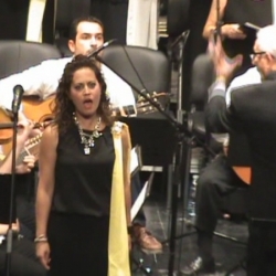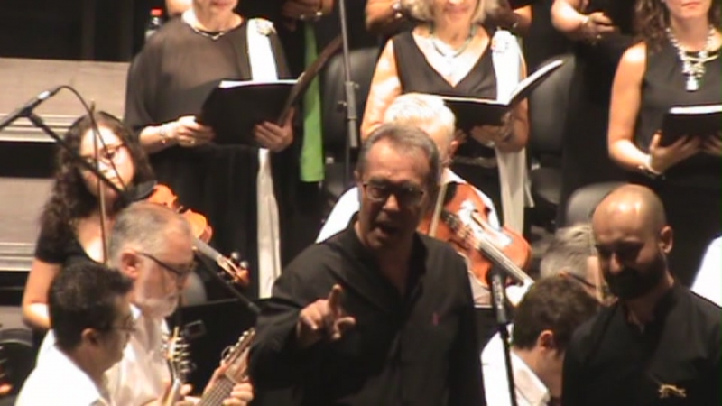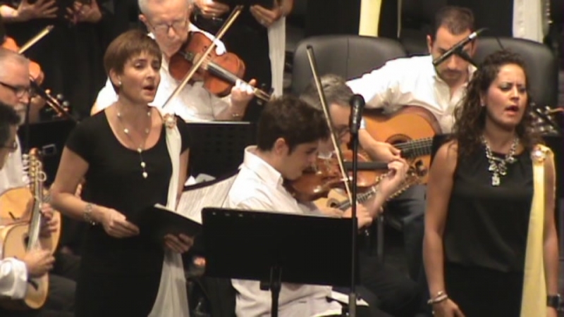 Dos batutas llevaron la ejecución musical y en el escenario estaban situados los componentes de la orquesta, con camisa blanca, y el coro todo de negro, con pinceladas de colores (rojo, verde, amarillo y blanco) en los foulards de ellas, que son los colores de la bandera egabrense y la de la Virgen de Sierra.