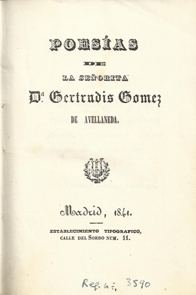 Poesías de la señorita D.ª Gertrudis Gomez de Avellaneda.-- Madrid : [s.n.], 1841 (establecimiento tipográfico, calle del sordo num. 11).