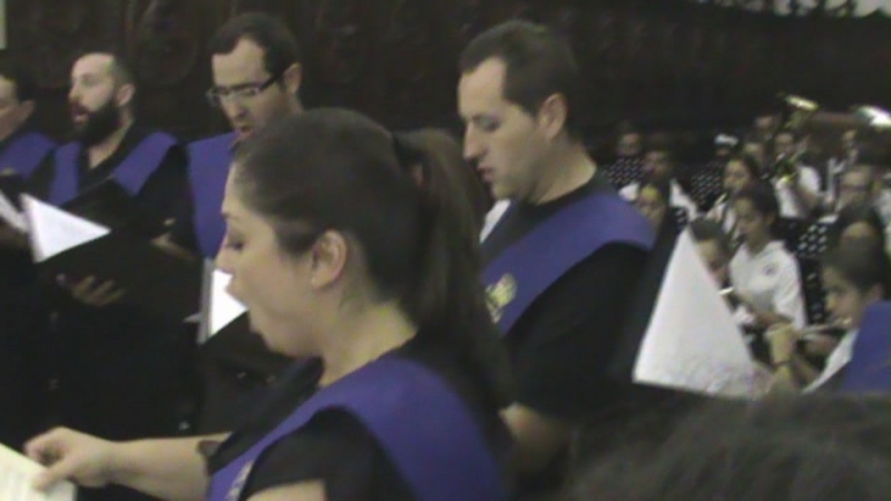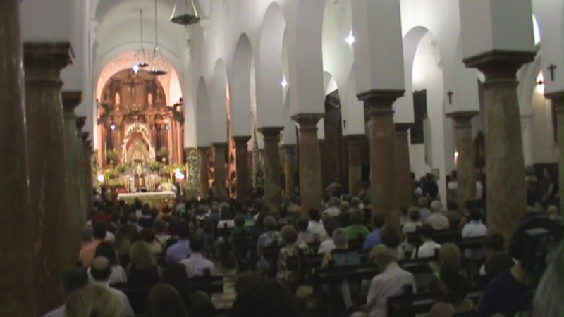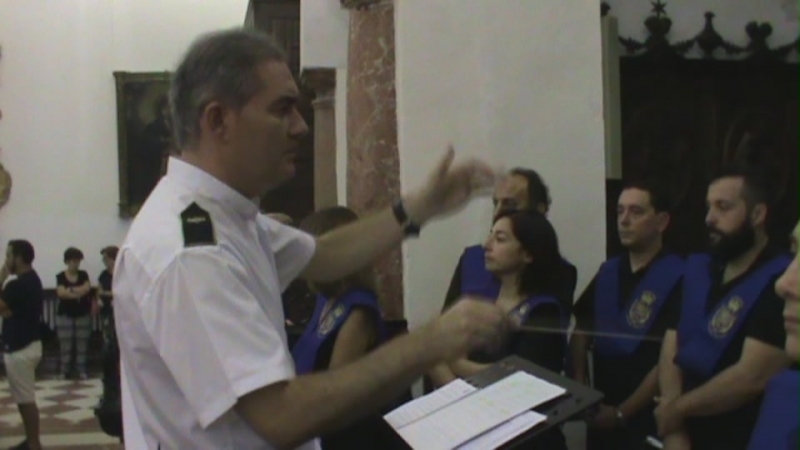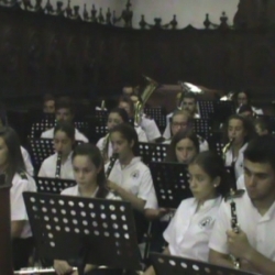 Bajo la batuta del Director de la Banda, Profesor Don Manuel González Rubio, se puso en los atriles, ni más ni menos que, la MISA DE LA CORONACIÓN en DO MAYOR de W.A. MOZART, KV 317, que fue dicha en las correspondientes partes de la celebración eucarística por el Coro y solistas, que fueron Mª Dolores Villatoro Campaña (Soprano), su hermana, directora del Coro, Mª José, que hizo el papel de Alto, Javier Sánchez (Tenor) y Enrique Pérez-Aranda (Bajo) y la Banda de Música, que acompañó con un sonido sutil (era una banda y no lo parecía, en un Mozart todo delicadeza) igual que el órgano que también sonaba. La obra estuvo espléndida, deliciosa, resaltando entre los solistas, como es de rigor en esta misa tan interpretada en versión concierto, la soprano Loles Villatoro, que ya desde su inicio en el Kyrie sabíamos por dónde iba a caminar. Hizo un Agnus Dei, que no se aplaudió porque estábamos en un templo en celebración litúrgica, pero nos dejó sin respiración. También los dúos y cuartetos de los solistas fueron perfectos. Y el coro en conjunto no tuvo nada que envidiarles. Se notaba las manos de su directora que en esta noche no hizo gala de su magnífica voz de soprano, aunque si la escuchamos como Alto.