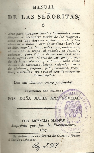 Manual de las señoritas ó Arte para aprender cuantas habilidades constituyen el verdadero mérito de las mugeres... / traducido del francés por Maria Ana Poveda.-- Madrid : Se hallará en la librería de Cuesta, 1827 (Imp. que fue de Fuentenebro)