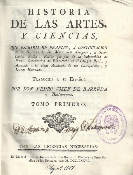 Historia de las artes y ciencias / que escribio en Frances ... Carlos Rollin ... ; traducido a el español por ... Pedro Josef de Barreda y Bustamante ; tres tomos.-- En Madrid : en la Imprenta de Blas Román ..., 1776.