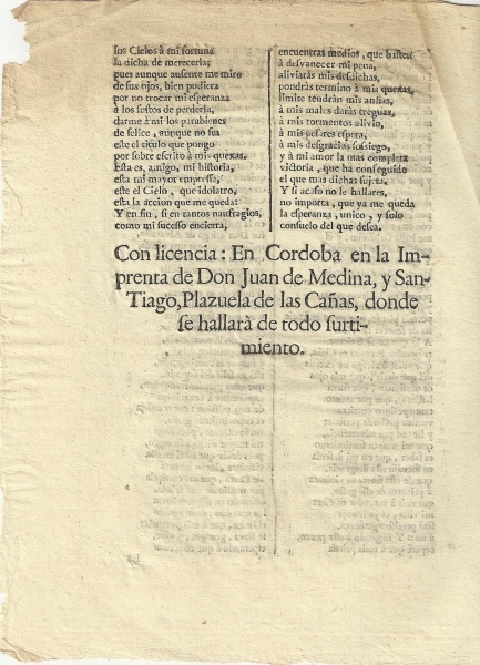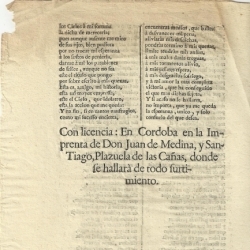 Hoy traemos como Libro de la Semana un pliego de cordel. Carece de fecha de publicación, pero al final de la nueva relación se indica que la licencia ha sido dada "En Córdoba en la imprenta de don Juan de Medina y Santiago, plazuela de las Cañas, donde se hallará de todo surtimiento". Como algunos de los libros hechos en la imprenta de Juan de Medina y Santiago se encuentran entre los años de 1763 a 1779, es muy posible que el pliego que mencionamos haya sido dado a la estampa en el tiempo del periodo aludido.