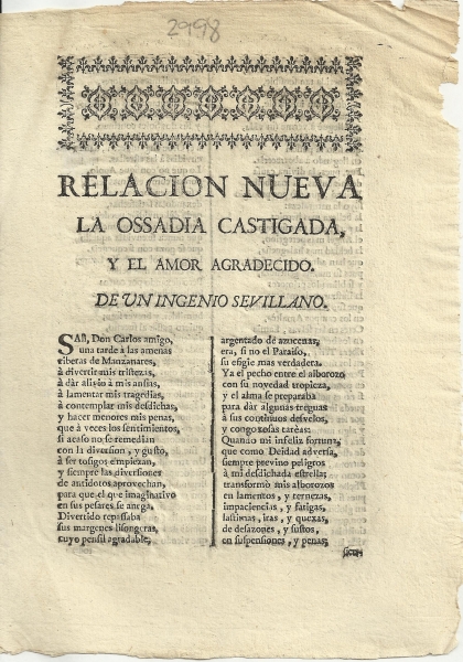 Relación nueva. La ossadía castigada, y el amor agradecido. De un ingenio sevillano.-- Con licencia: En Córdoba en la Imprenta de Don Juan de Medina y Santiago, Plazuela de las Cañas.--