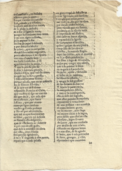 A la carroza se llegó un atrevido embozado que estaba en la ribera, subiéndose en el estribo y pretendiendo tomar la mano de la dama con "notable desvergüenza". Una de las criadas, airada, imploró con muchas voces la defensa de su señora. Entonces, él, viendo la acción de aquel insolente rompe en cólera y poniendo mano en su espada "con una estocada fiera" se halló satisfecho, y el otro "agonizando en la arena". En seguida cuenta que habló a Laura de esta manera: "le dije: adorada prenda, / queda a Dios, que voy sin alma, / porque me la llevas presa / y solo ausentarme siento, / porque pienso que en tu ausencia / ha de fenecer mi vida". Ella, parece que le expuso que no excediera el riesgo que proclamaba y que no corriera peligro su gallarda persona. La cuestión es que no reparó en que "un gran tropel de ministros" venía siguiendo sus huellas. Cercado, tiene que abrirse paso con su espada y se refugia en la iglesia de "Gerónimo el invicto". Allí supo que el muerto en la pendencia fue don Diego de Alvarado, "quien por vengar una ofensa / que a su parecer le hizo / en negarle a Laura bella / su padre, quiso, violando / el lustre de su nobleza / satisfacer su osadía / y apagar la sed grosera / de los favores de Laura".