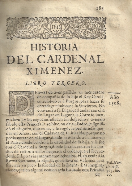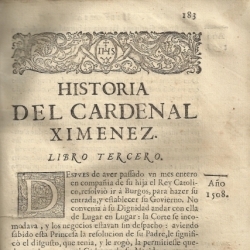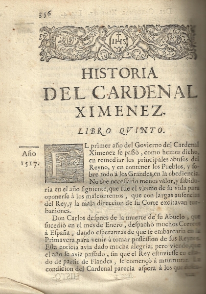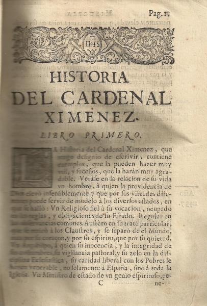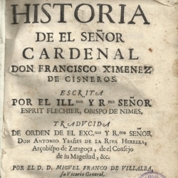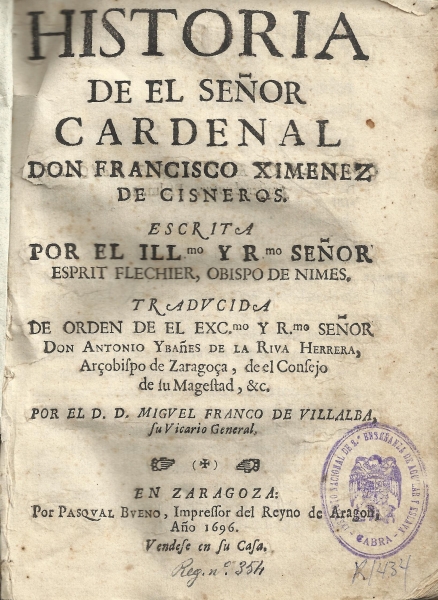 "Historia de el señor cardenal don Francisco Ximenez de Cisneros", escrita por Esprit Fléchier, obispo de Nimes, traducida por Miguel Franco de Villalba (Zaragoza, 1696)