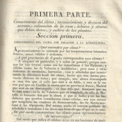 La Cartilla agraria se estructura en tres partes, dividida cada una en diversas secciones. En la PRIMERA PARTE, la sección primera está dedicada al conocimiento del clima con relación a la agricultura; la segunda, al conocimiento de las tierras laborables; la tercera, se refiere a la necesidad de tener agua para el cultivo y modo de buscarla; la cuarta es sobre la posición de la casa de campo, distribución de ella y de todo el terreno; la quinta, sobre abonos; la sexta, sobre la clasificación de simientes y en particular sobre los cereales; la séptima, sobre las plantas leguminosas: la octava, sobre las raíces perpendiculares y tuberosas; la novena, sobre los textiles: la décima se dedica a las plantas tintóreas que sirven para las artes y de otras para el consumo; la undécima, sobre los prados y plantas gramíneas, y la duodécima sobre la alternativa de cosechas. Hay una adición a la primera parte que es un complemento para el tratado de huertas.