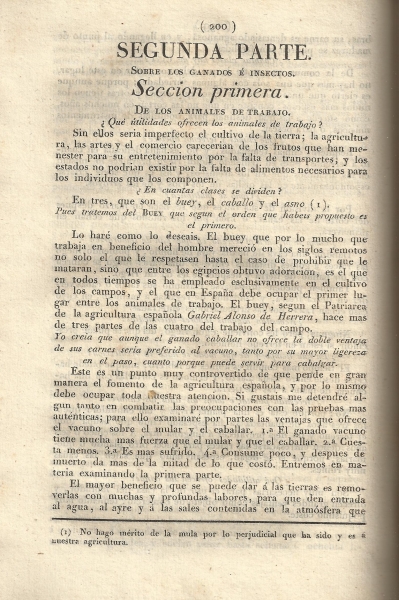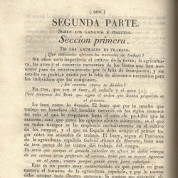 En la SEGUNDA PARTE se diserta de los ganados e insectos. La sección primera habla de los animales de trabajo; la segunda, sobre los animales sedentarios que se crían por sus carnes o lanas; la tercera, sobre las aves y la cuarta, sobre los insectos.
