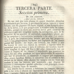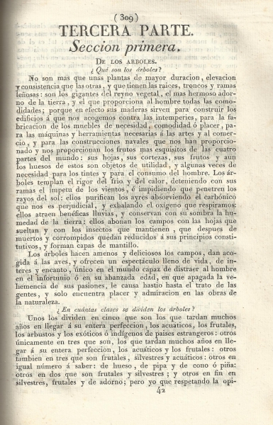En la TERCERA PARTE se alude a los árboles. La sección primera la forma una serie de preguntas que encuentran la correspondiente repuesta: ¿En cuántas clases se dividen los árboles?, ¿De qué modo se hace la multiplicación ovípara o por simiente?, ¿Cómo se hace la multiplicación vivípara?, etc.; la segunda, sobre injertos; la tercera, sobre la poda; la cuarta, sobre las enfermedades de los árboles; la quinta, sobre los árboles que mejor prueban en climas húmedos; la sexta, de los árboles que pueden criarse en climas frescos; la séptima, de los árboles que prueban en los climas secos y la octava, sobre los árboles que prueban mejor en climas cálidos.