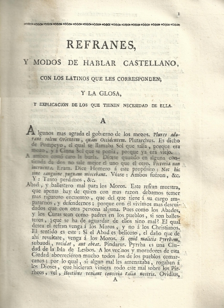 "Refranes, modos de hablar castellano, con los latinos que les corresponden y la glosa y explicación...", compuesto por Jerónimo Martín Caro y Cejudo (Madrid, 1792)