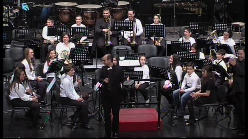 Comenzó el Concierto con la BANDA JUVENIL (en su 10º Aniversario) y la llegada de un cohete espacial con su único tripulante, el director de la Banda Víctor Herrero Pareja, que descendió de la nave vestido de astronauta, se dirigió al podio, con la "sorpresa" de los músicos jóvenes y empuñando la batuta nos ofreció una selección de la B.S.O. de "Apolo 13" (J. Horner) que consiguió buen sonido. Ya pasada la "sorpresa" se quitó el traje de astronauta y se vistió de director de orquesta y nos hizo con sus chicos la "difícil" obertura de la ópera "El Barbero de Sevilla" (G. Rossini). Tras ésta se cantó el "cumpleaños feliz", dirigido a la Banda por cumplir 10 años. El director apagó las velas de una tarta conmemorativa del evento. Por último otra selección de la B.S.O. de "Frozen" (K. Anderson/R. López), la película de animación más taquillera de la historia. Fue muy bien llevada por su director e interpretada por la banda.
