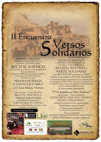 Decía que Cabra será protagonista solidaria, gracias a la poesía. El sábado 16 se presentará la antología NEcesarias PALabras y José Infante Martos recibirá el Premio de poesía «Ciudad de Cabra» en el Cinestudio, actos que se completarán por la tarde con una paella solidaria otra lectura en el Centro Filarmónico; lo que reunirá a un buen número de poetas y amantes de este género literario, procedentes de toda España. El encuentro continuará el día 23 con otro recital en el Centro Filarmónico y en El Jardinito con un concierto de Dar Tika. En ambos días habrá una paella solidaria a beneficio de Creciendo en Nepal, el 16, y de AID Children of the world, el 23.